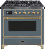 Experience culinary excellence with the 36" Majestic freestanding range by ILVE. This kitchen centerpiece boasts a large European Convection oven for precise cooking, complemented by a full-width dishwarming drawer. The semi-sealed burners on the cooktop offer versatile cooking options. The Majestic Series stands out with its unique style, customizable to elevate any kitchen. Brass Burners with Nanotechnological Coating ensure durability and easy cleaning, while Dual Gas Burners provide up to 20,000 BTU power. The 4.3" TFT full-touch screen simplifies operation, and Continuous Cast Iron Grates offer seamless pot maneuvering.